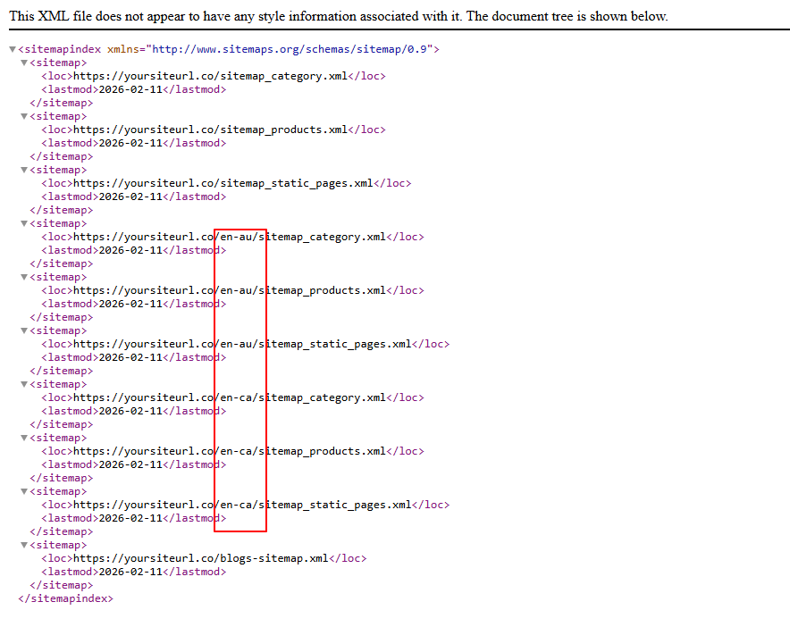 For multi-country brands, locale-specific sitemaps are generated automatically.